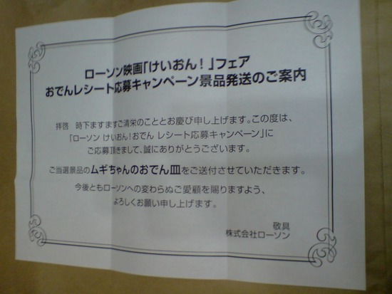 上で報告があったローソンの抽選品、ムギちゃんのおでん皿当たってたよ!
