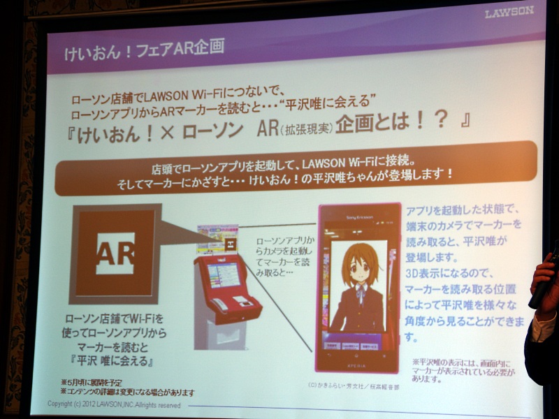 >映画「けいおん!」とのコラボ企画として、ローソンアプリでマーカーを読み取ると、AR(拡張現実)技術によりローソン店内にけいおん!の平沢唯が登場する企画を5月ごろに展開する予定が発表された。