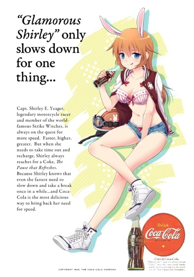 調子乗って意訳すると・・・ グラマラス・シャーリーはアレでほっと一息 バイクレースで世界的に、そしてあのストライクウィッチーズの一員であるしゃーろっと・E・イェーガーさんはいつも速さを追求している。速く、高く、よりすごく。 そんな彼女が休憩してエネルギーをチャージする際に手にするのはコカ・コーラである。写真がそのリフレッシュの一時だ。 シャーリーさんは最速を目指すにあたって、ゆっくり休憩することが必要としっている。そして彼女は今日もコカ・コーラでオイシくスピードを追求するのだ!!