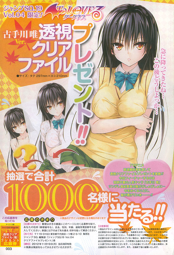ジャンプSQ19Vol.4のTo LOVEるダークネスプレゼント企画は唯の透視クリアファイル!