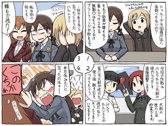 バルクホルン大尉「馬鹿力」、ユーティライネン中尉「弾に当たらない」、リトヴャク少尉「耳からアンテナ」、ルッキーニ少尉「丸いのいっぱい」