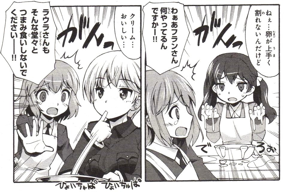 アフリカの食糧事情は真美が来てから改善されたね。 それにしても主計殿がうらやましい。美しい上官・すぐ近くにアフリカの星・シャーロットら若いウィッチにも慕われ…他の部隊に比べ命の危機は高いものの、それでもうらやましい。