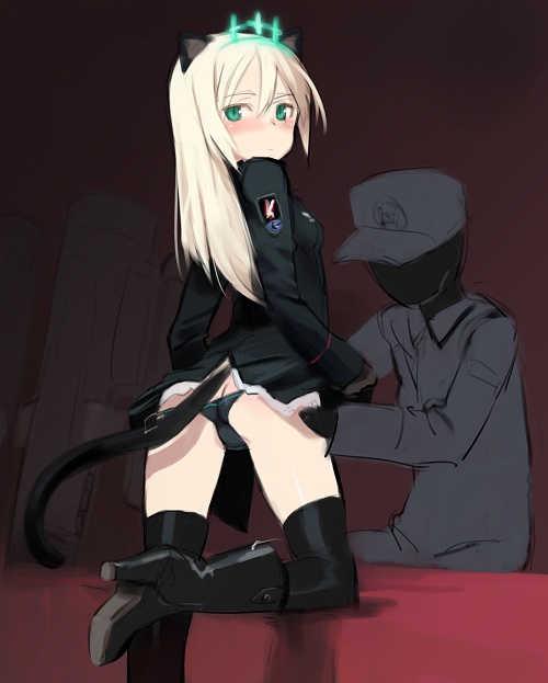 試作装備のフィッティングを行う大尉。夜間視力強化の魔方陣が編み込まれていると言う触れ込みだが、元々の強度不足に加え、ウィッチの魔法使用によるエーテル反応で急速に耐久力が低下する欠点もあり、装着には専門の整備員が必要であった。