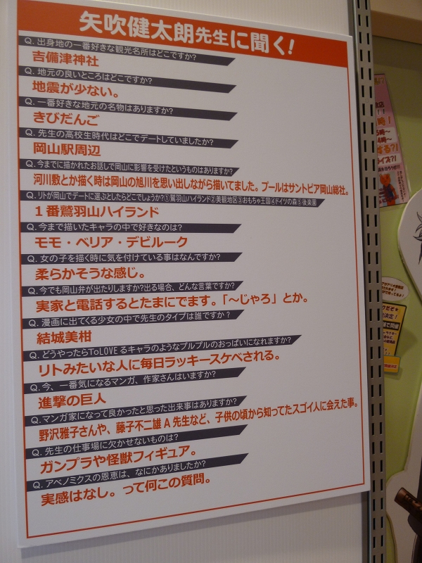 去年の11月に、ジャンプSQ創刊6周年フェアがジャンプショップにて開催されたのですが、ご当地コーナーというコーナーがありまして、アリオ倉敷店では岡山出身の矢吹先生の質問パネルがあったわけなんです。