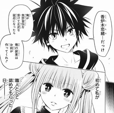 今から312日前。祭里ちゃんのおじいちゃんは祭里のために手裏剣の製作を、恋緒ちゃんのお父さんに頼んでいたのでした。その手裏剣の仕上げをした恋緒ちゃんは、風の術に合うようにと余計な調整をしてしまい、父からは勝手なことをしたと思われているのが不満そう。そこで問題なく手裏剣を使いこなして「風魔手裏剣」と名付けたのが祭里くん(※当時)でした。