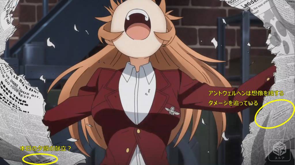 後になってルッキーニがシャーリーのストライカーを借りて出撃するシーンがあるじゃないですか。親はそのシーンでなんでルッキーニは自分のじゃなくてシャーリーの穿いてるんだ?と疑問に思ったらしく、このシーンで2人のストライカーが壊れてることに気が付かなかったみたいなんですよね。「あの描写だけじゃ分かんねーわ」と言っていましたが、実際自分もあの出撃のシーンで、なんでシャーリーがルッキーニを探していたのか一瞬考えましたからね。この破損したシーンから出撃のシーンまで結構間に空きがありましたし、Bパートはただでさえ色々なことが起きていたので、もう少しストライカーが壊れたことを強調しておいた方が分かりやすかったんじゃないかなと思います。でもBパートはこの後が濃すぎて尺がなかったのかなぁ…www