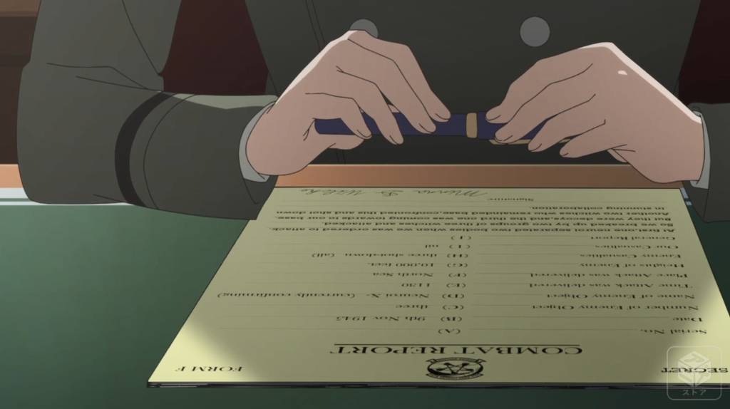 これは前回第3話で登場した分裂型のネウロイとの戦闘記録ですね。他のウィッチ2名と記載していますが、芳佳と静夏は名目上1人分としているのかな?今回こうしてバルクホルンが部屋にいるのはこの戦闘記録を提出しにきたからでしょうか。