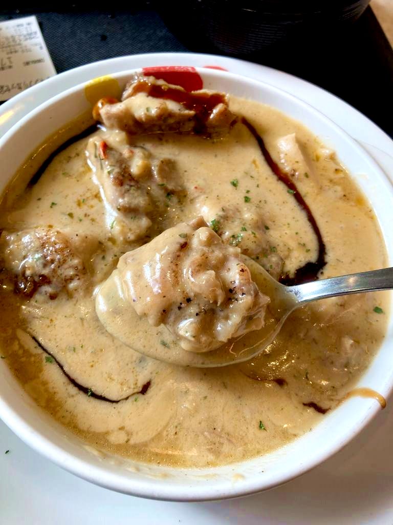 そう、このメニューはオマール海老のソースを使ったチキン煮込みなのである。そのためオマール海老が具として入っているワケではないのだ。そもそも松屋というチェーン店でオマール海老を食べれるなどありようがないのだが…。