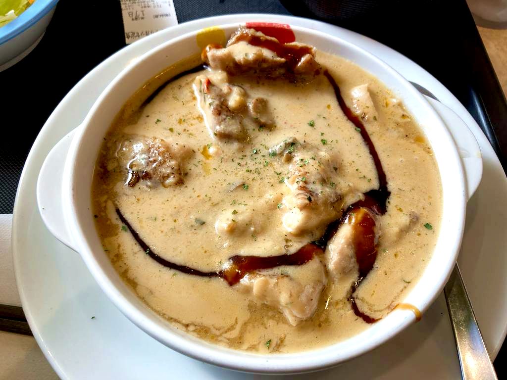 しかしこの定食、チキン煮込みとしては非常に美味しいのです。オマール海老のソースは絶品で、個人的にクリーム煮はあまり好きな部類ではないのですが、少しツンとくる海老の風味みたいなのも感じてとてもチキンと合っています。