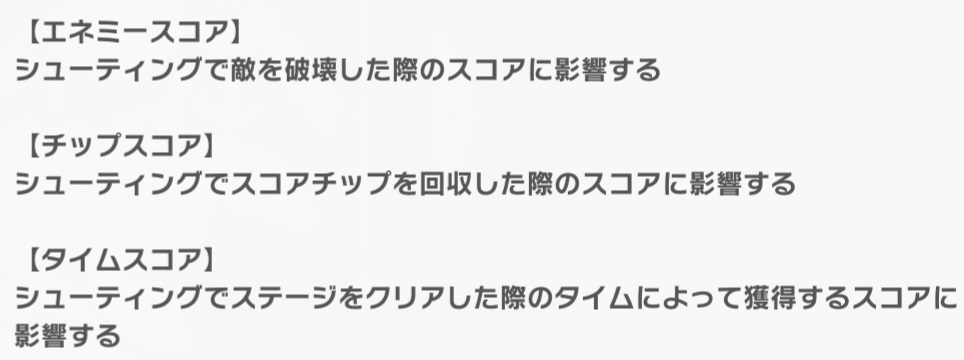 スコア値の獲得方法についてはお分かりいただけたかなと思いますが、ではスコア値を実際に獲得した際の値について見ていこうと思います。まずはステージをプレイしている際の各スコア値の計算方法から説明していきます。