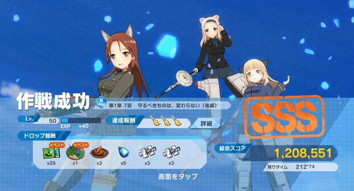 そのため、大型ネウロイ前のWAVEについては、基本的にはスコアチップランクが虹勲章になることを目標にしながら、チップスコアを集めていき、虹勲章になったことを確認したら、ネウロイを倒して稼ぎに行くという戦法が一番分かりやすいかなと思います。