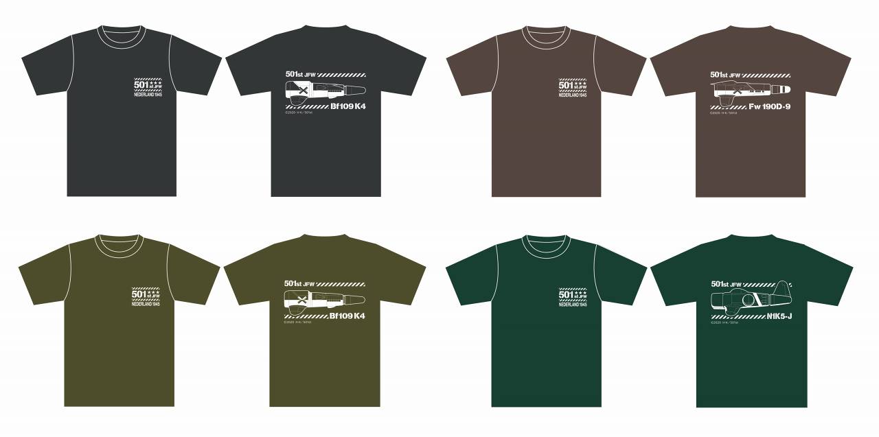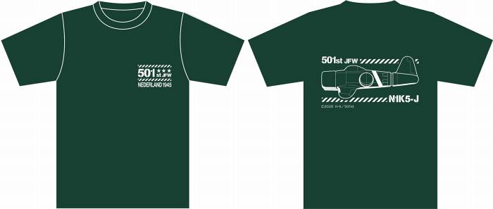 左胸には第501統合戦闘航空団の基地となったネーデルラントと1945年がプリント。そして背面には各ウィッチが穿くストライカーユニットがプリントされたTシャツです。