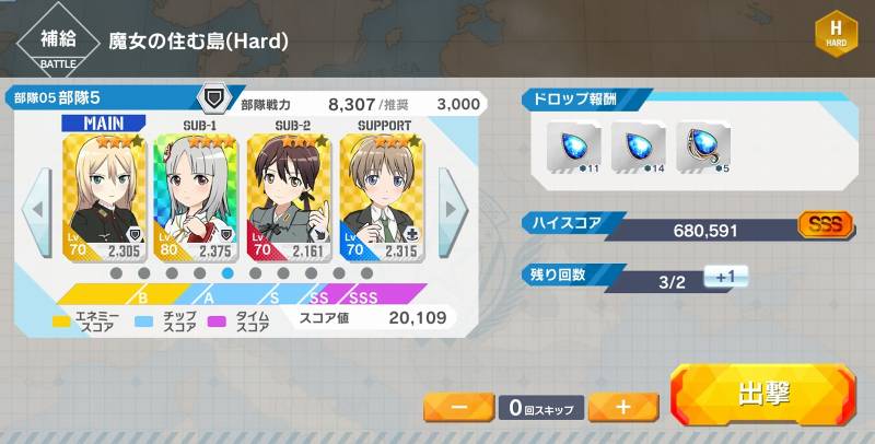 「補給」には少し前に「スキップ機能」が追加されました。これは普段の出撃とは違い、出撃した体として結果だけ確認できる機能ですが、実はこの「スキップ機能」も出撃にカウントされています。