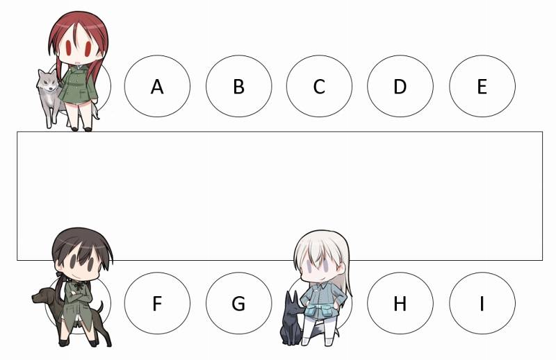 これは第501統合戦闘航空団「ストライクウィッチーズ」が1945年秋以降に駐留していた、デン・ヘルダー基地内にある食堂の見取り図になります。この中で、①宮藤芳佳曹長、②服部静夏少尉、③サーニャ・V・リトヴャク中尉が座っていた席は、それぞれどこでしょうか。