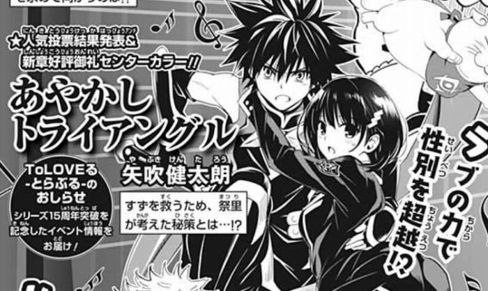 こちらは本日発売の週刊少年ジャンプ41号の次号予告になるのですが、「あやかしトライアングル」センターカラーかー。最近の掲載順位はアテにならないなーなどと思っていると、まさかのTo LOVEるのおしらせ! 不整脈かと思うくらい心臓がバクバクし始めたぞオイ!