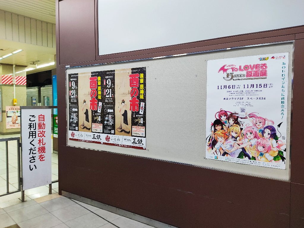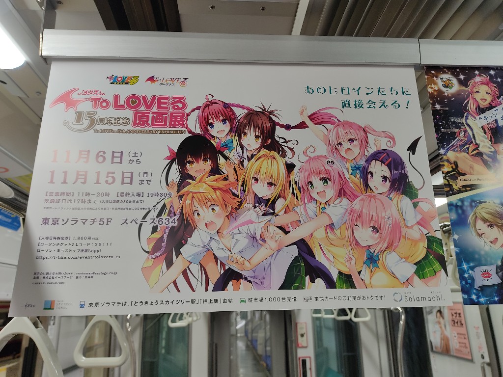 いよいよ今日から「To LOVEる原画展」の開催がスタート! 東武線の駅や中吊り広告にもポスターが掲載されているぞ! ToLOVEる-ニュース- 2021.11.06 目次 いよいよTo LOVEる原画展スタート東武浅草駅東武線の車内会場のスペース634 いよいよTo LOVEる原画展スタート 東武浅草駅 東武線の車内 会場のスペース634 整理券番号が床下に貼ってあったので壁側に沿って入場する前に並ぶっぽい。 11時の入場チケットは取れなかった雑魚なので14時に突撃します。楽しみすぎて吐きそう。