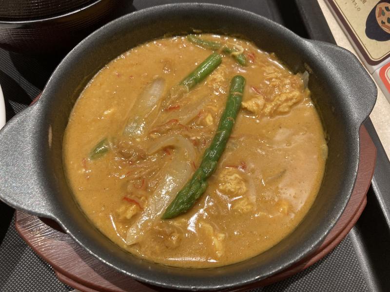 味は松屋風ともあって塩分が強めでご飯が進むお味。でもどこか甘みもあって、ココナッツミルクの風味も感じます。アスパラも味がしっかりしていてカレーソースと非常に合います。(※本来のプーパッポンカレーはカレー粉炒め)