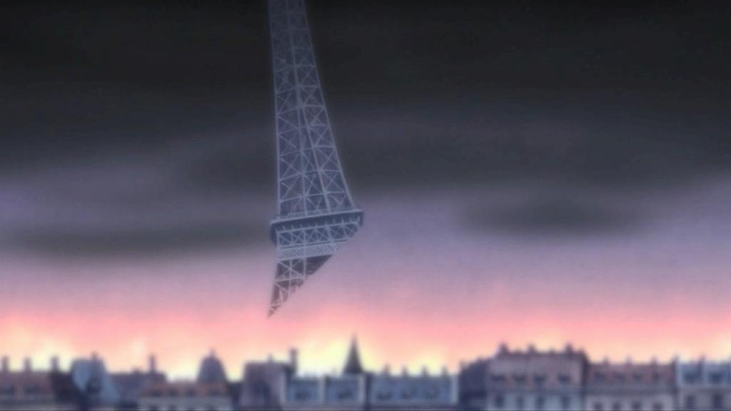 ▼ストライクウィッチーズ第1話冒頭でネウロイの攻撃によって崩されるエッフェル塔。