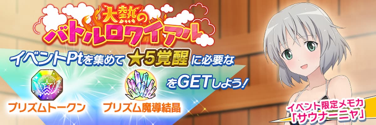 イベントPtを貯めるとサーニャの★3メモリーズカード「サウナーニャ」や、「大熱のバトルメモカ召集指令書」が入手可能!
