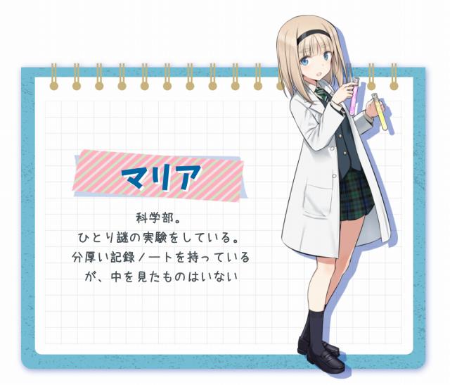 コーナーワークが苦手、バトンの受け渡しが下手…マリアは何か目的があって実験しているのだけど、結果生まれるのは謎の惚れ薬、服が透明になる、性格反転薬など…(本人曰く失敗