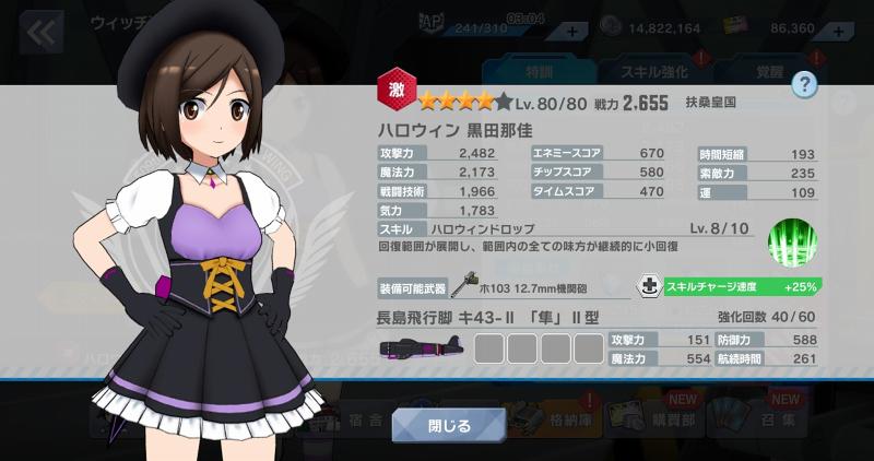 今でこそ新規ウィッチが実装されても、恒常ウィッチとの違いはスキルや衣装・ストライカーのカラーリングとパラメータくらいですが、このハロウィン 黒田那佳は武器も異なり、しかも専用武器「ホ103」が与えられたのです!