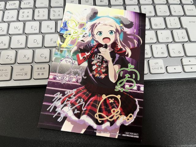 今回のお渡し会では2ndライブのMV集ジャケットイラストを使用したイラストカードなんですが、ちゃんと第1部と第2部それぞれのキャストさんのサインが入っていて芸が細かい。