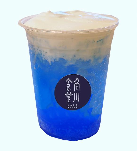 ブルーハワイやブルースピルリナを合わせた青いソーダに、真っ白な生クリームを浮かべました。