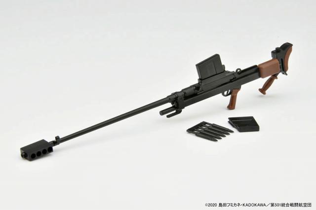 本製品は、リネット・ビショップなど狙撃系の空軍ウィッチが使用するブリタニア製対装甲ライフル『ボーイズMk.1』の組み立て式1/12スケールモデルです。今作は、大型箱状マズルブレーキなどの劇中仕様再現に加え、ボルトアクションの可動も実現しました。