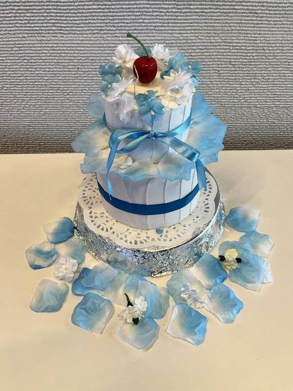 前回のバースデーイベントでもやったケーキ(※食品ではない)にリボンなどの装飾をしてデコレーションケーキを作るコーナー。