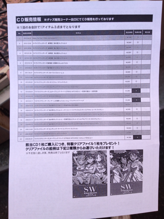 【みんデキbis】グッズ販売コーナー情報 CDを買うと秘め歌3&4のイラストを使ったクリアファイルが特典で付いてくる! バニーシーツを含め全て3限みたい ワールドウィッチーズ-ニュース- 2013.10.13 物販の追加は特に無いですな。CDでは1&2期のOPとprivate wing、つまりシングル盤以外を1枚お買い上げにつき秘め歌3&4のイラストのクリアファイルが特典で貰えます。 WWタペストリーはライブ後にお渡しで、シーツ含め全て3限になってます。