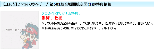 3月26日発売のコミックス「ストライクウィッチーズ 第501統合戦闘航空団」第1巻をアニメイトで購入すると複製ミニ色紙が特典としてもらえるぞ!