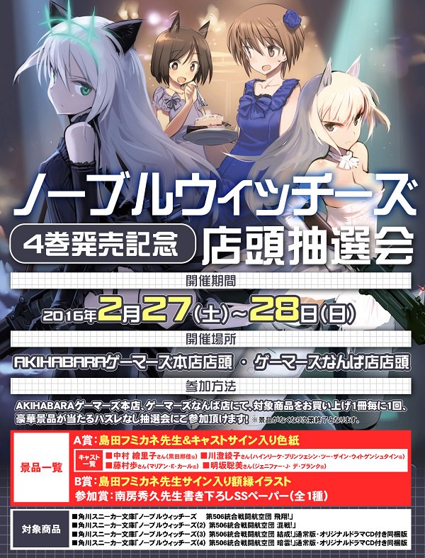 全国一千万スト魔女ファンの皆様!明日~明後日は秋葉原と難波にあるゲーマーズさんでノーブルウィッチーズ店頭抽選会が実施されますよ!https://t.co/tEBJEVRTTc 豪華景品が当選するかもしれない貴重な機会、お見逃し無く! pic.twitter.com/PfOq4uO38B