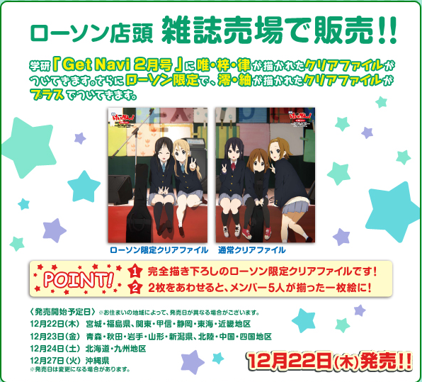 付録のクリアファイルが唯・梓・律、ローソン限定で貰えるおまけクリアファイルが紬・澪で2枚合わせると1枚絵になるとかもう・・・