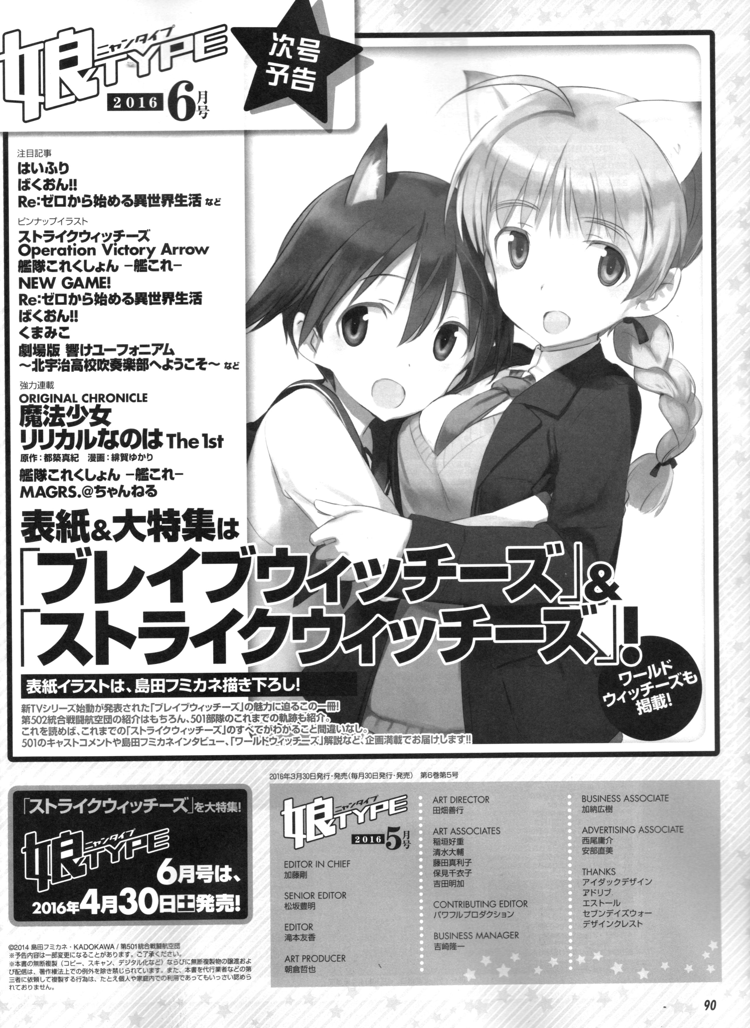 4月30日発売の娘TYPE6月号の表紙&特集は「ブレイブウィッチーズ」&「ストライクウィッチーズ」!表紙は島田フミカネ先生描き下ろし! ワールドウィッチーズ-ニュース- 2016.03.30 娘TYPE 2016年6月号価格:◎表紙&特集は「ブレイブウィッチーズ」&「ストライクウィッチーズ」!◎連載企画「ワールドウィッチーズ イマジナリーノート」掲載予定◎ラジオレポート掲載 ここで502メンバー勢ぞろいとかだったら娘TYPE編集部は有能