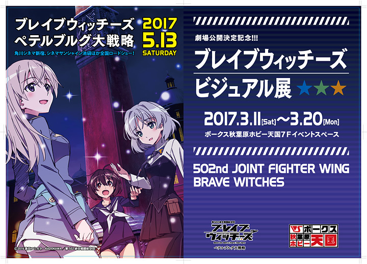 5月13日(土)から劇場公開される「ワールドウィッチーズシリーズ 第502統合戦闘航空団ブレイブウィッチーズ ペテルブルグ大戦略」を記念して、ボークス秋葉原ホビー天国7Fイベントフロアにてビジュアル展の開催が決定しました!会場では、数々の名場面や各種資料などを展示!!劇場公開の前にもう一度ブレイブウィッチーズを振り返ろう!会場では各種グッズのほかに、劇場チケットも販売いたします!また、会場で関連商品をお買上げ¥2,000(税別)毎にオリジナルブロマイド(全10種)をプレゼント!
