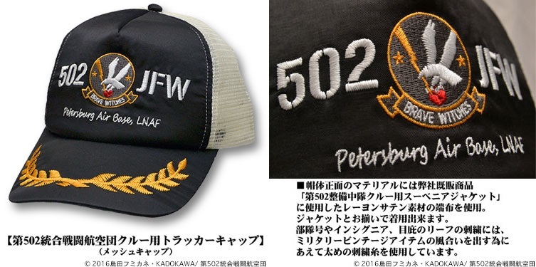 「ブレイブウィッチーズ」の世界観を盛り込んだ、502JFW所属隊員が着用したキャップをイメージしたトラッカー(Gimme)キャップです。