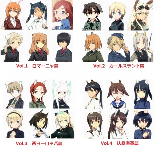 ゲルトルート・バルクホルン(CV:園崎未恵)、エーリカ・ハルトマン(CV:野川さくら)、グンドュラ・ラル(CV:佐藤利奈)、ヴァルトルート・クルピンスキー(CV:石田嘉代)、エディータ・ロスマン(CV:五十嵐裕美)、ハンナ・ユスティーナ・マルセイユ(CV:伊藤静)ほか