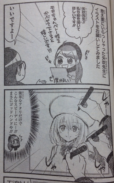 ジャンプSQにて「タレント奮闘記koppy」という作品が連載されているんですが、現在発売中の3月号に掲載されているエピソードの中に矢吹先生からモモがベレー帽を被ったイラストが入ったサイン色紙を作者が頂くというものがありました。まぁこれは知り合いの方に教えてもらったんですけど。
