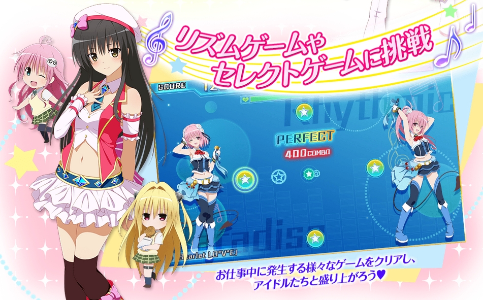 本作は,「ジャンプ SQ.」にて連載中のコミック「To LOVEる-とらぶる- ダークネス」を題材としたアイドルプロデュースゲームだ。mobageにて携帯電話/スマートフォン向けに配信中の同名作品を,PCでプレイできるようにしたものとなる。プレイヤーは,「ララ・サタリン・デビルーク」や「西連寺春菜」,「古手川 唯」といった原作でおなじみのヒロイン達でアイドルグループを組み,仕事やレッスンなどを通じて育てていく。仕事では,リズムゲームをはじめとするいろいろなゲームに挑戦することになるようだ。