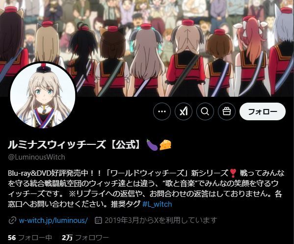 個人的には今の公式アカウントを角川が動かすよりも、今ルミナスウィッチーズをプロデュースしている水野大輔さんやその周りのスタッフさんに譲渡した方がいいんじゃないかなと思うんですけどね。ウィッチーズの情報はワールドウィッチーズの公式アカウントで呟けばいいワケですし。そうしたら「作品」と「ユニット」でアカウントを分かりやすく分けることができますよね。